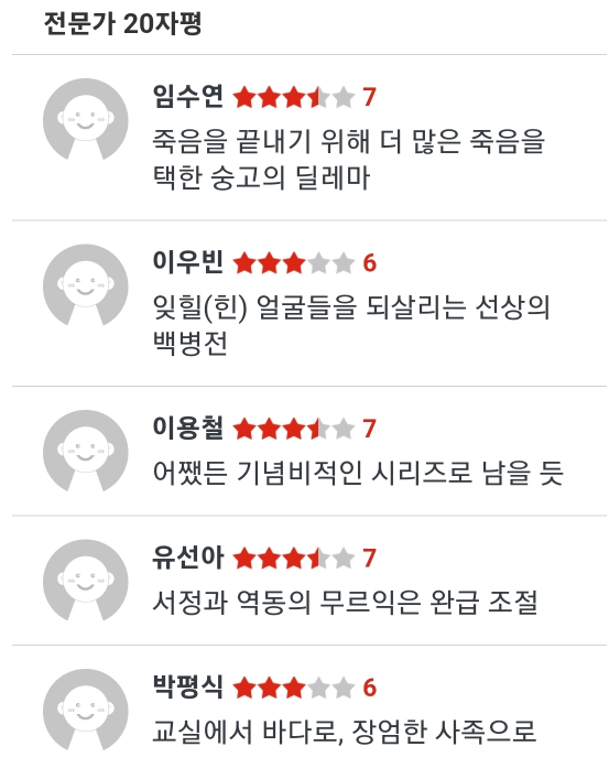 - 임수연 (7점) : 죽음을 끝내기 위해 더 많은 죽음을 택한 숭고의 딜레마