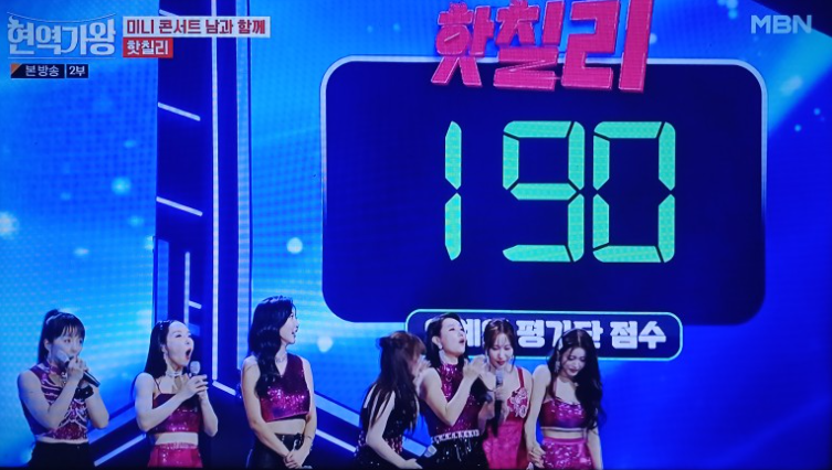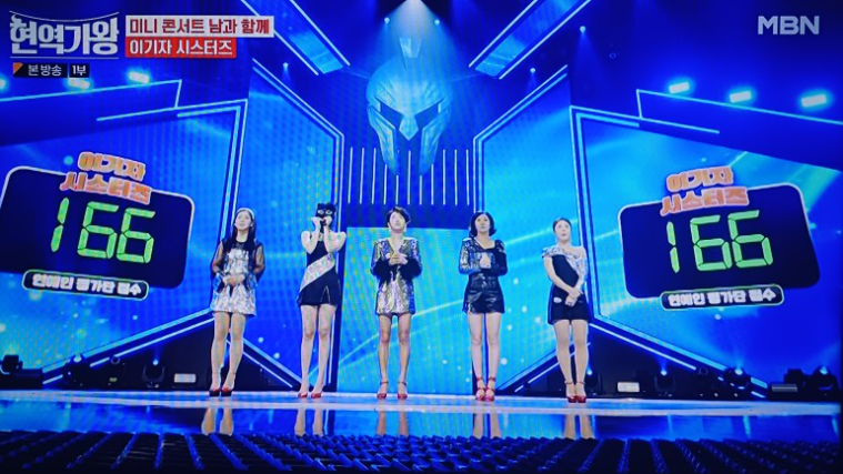 현재 연예인 평가단 점수는 1위 옥구슬 아씨들 195점, 2위 핫칠리 190점, 3위 007밴드걸 189점, 4위 비빔걸스 171점, 5위 이기자 시스터즈 166점입니다.