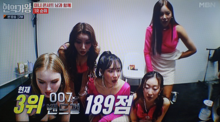 두번째 팀은 '007밴드걸'입니다. 김나희, 조정민, 마리아, 두리, 김산하가 한팀으로, 대장은 두리입니다. 함께하는 남성가수는 래퍼 한해입니다. '007밴드걸'은 총 5곡을 불렀습니다. '007밴드걸'은 189점을 받았습니다.