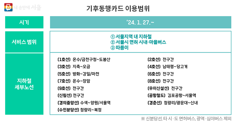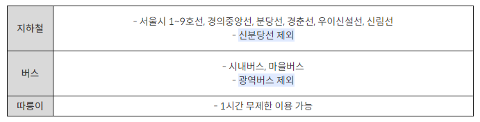 기본적으로 지하철은 '신분당선 제외', 버스는 '광역버스 제외'라고 되어있습니다. 하지만 지하철의 경우 신분당선을 제외한 노선에서도 서울시에서 승하차하는 노선에만 이용이 가능하니 세부적으로 볼 필요가 있습니다.
