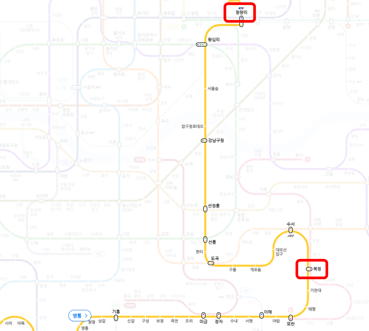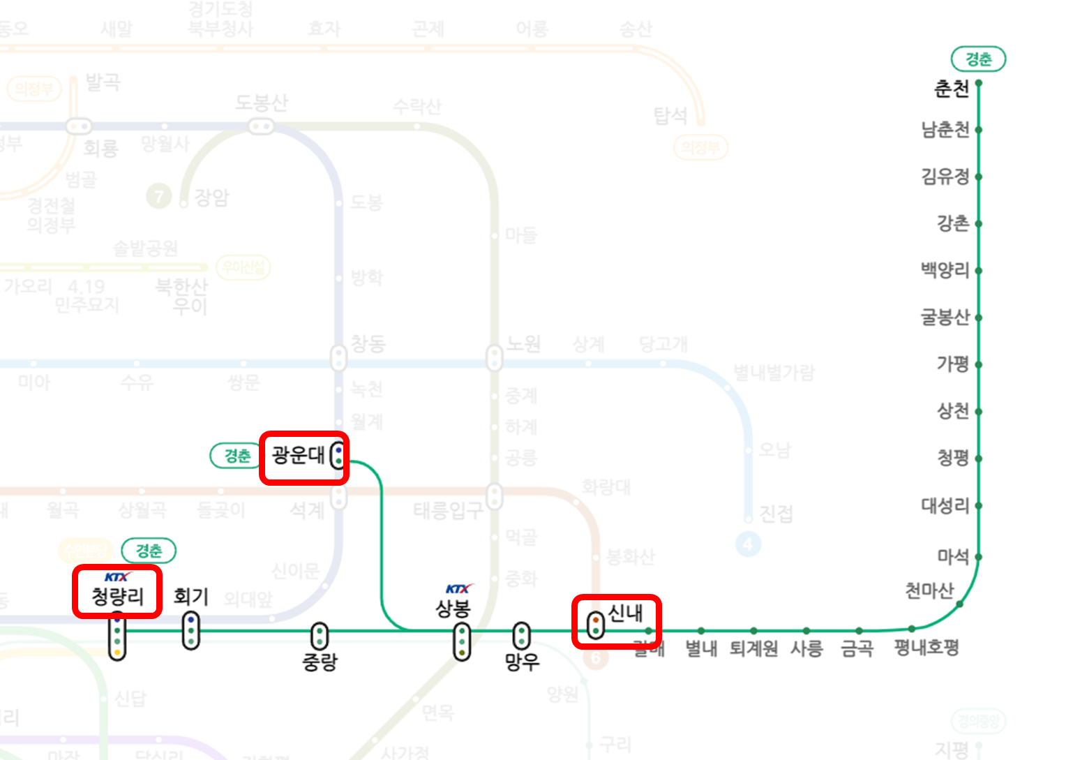 경춘선의 경우는 청량리에서 신내까지 또는 광운대에서 신내까지만 이용이 가능하여 '춘천, 강촌, 가평, 청평, 금곡, 퇴계원' 역 등에서는 이용하실 수 없습니다. (아래 노선도 클릭하여 확인↓)