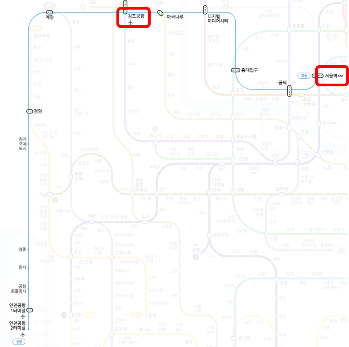 공항철도 노선은 김포공항부터 서울역까지에서만 사용이 가능합니다. 따라서 '청라국제도시, 인천공항터미널' 등에서는 이용할 수 없습니다. (아래 노선도 클릭하여 확인↓)