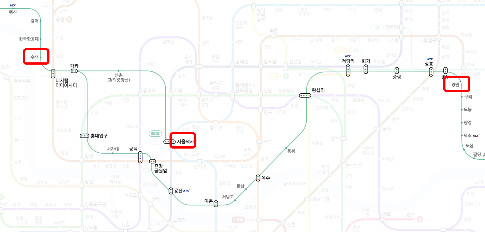 경의중앙선은 수색에서 서울역까지 또는 양원에서 서울역까지만 이용이 가능합니다. 따라서 '임진강, 파주, 운정, 탄현, 행신, 한국항공대, 구리, 덕소, 팔당, 아신, 양평, 지평' 등의 역에서는 이용할 수 없습니다. (아래 노선도 클릭하여 확인↓)