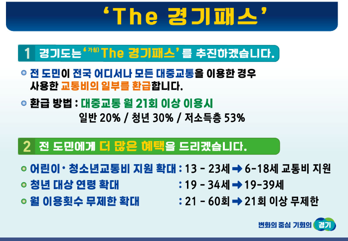 더경기패스는 K패스와 동일하게 월 21회 이상 이용시 환급하지만 그 대상이 전국의 모든 대중교통이기 때문에 K패스보다 더 유리합니다. 또한 환급횟수가 무제한이라는 점도 K패스보다 유리한 점입니다.
