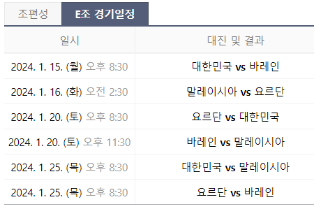 기타 아시안컵 E조의 경기일정은 아래와 같습니다.