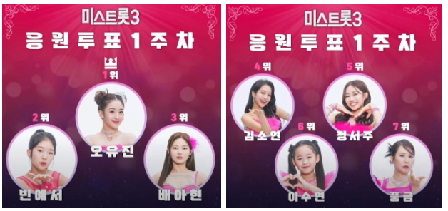 1위 빈예서, 2위 오유진, 3위 배아현, 4위 정서주, 5위 김소연, 6위 미스김, 7위 복지은