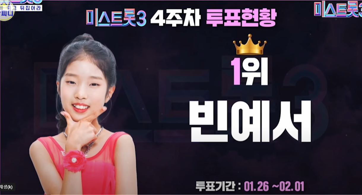 1위 빈예서와 2위 오유진은 지난주와 그대로입니다.
