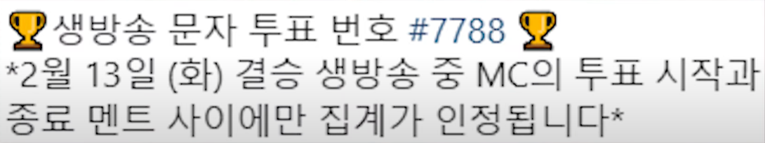 첫째, 생방송 중 MC 신동엽이 투표 시작을 선언해야 합니다. 밤 10시쯤이 예상됩니다. 실시간 방송에서 신동엽이 "실시간 문자투표 종료합니다"라는 멘트를 하기 전까지만 유효합니다.