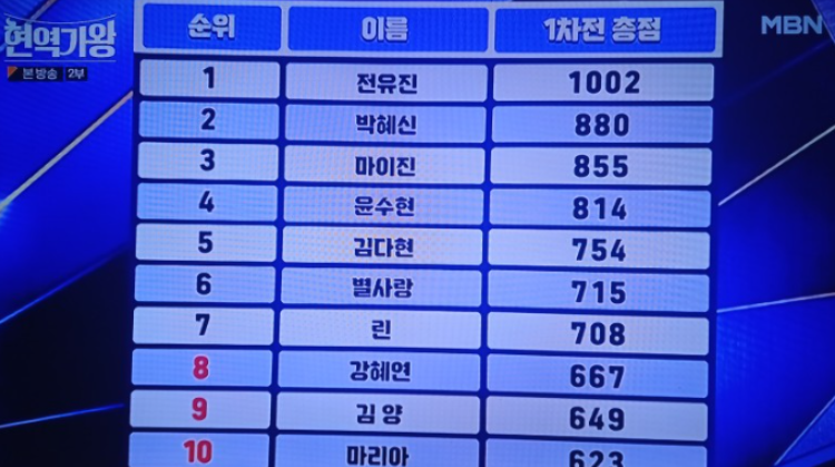 현역가왕이 대장정을 마무리하고 TOP7과 우승자를 발표했습니다. 오늘은 현역가왕 결승전 결과를 리뷰해드리도록 하겠습니다. 현역가왕 1라운드 지난주에 펼쳐졌던 결승전 1라운드는 밀어내기