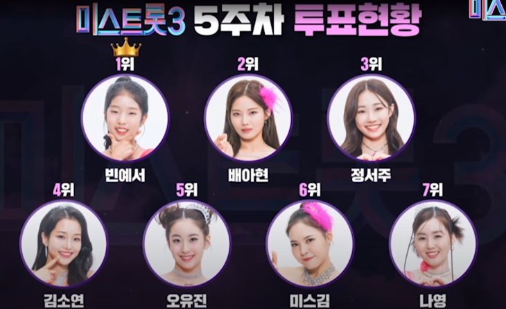 1위 빈예서, 2위 오유진, 3위 배아현, 4위 정서주, 5위 김소연, 6위 미스김, 7위 복지은