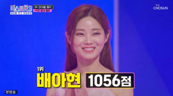 모든 무대 끝에 결과가 발표됐습니다. 1라운드 1위는 1056점을 얻은 배아현이었습니다. 뒤이어 2위 나영(1055), 공동 3위 김소연·정서주(1053), 5위 오유진(1048), 6위 미스김(1045), 7위 빈예서(1036), 8위 복지은(1021), 공동 9위 정슬·윤서령(1020), 11위 김나율(1019), 12위 천가연(1018) 13위 곽지은(1012), 14위 염유리(1005) 순이었습니다.