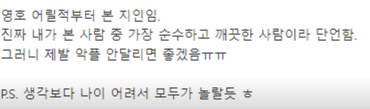 영호를 어릴적부터 본 지인이라는 분의 글인데요, 영호는 진짜 본인이 본 사람 중 가장 순수하고 깨끗한 사람이라고 하네요.