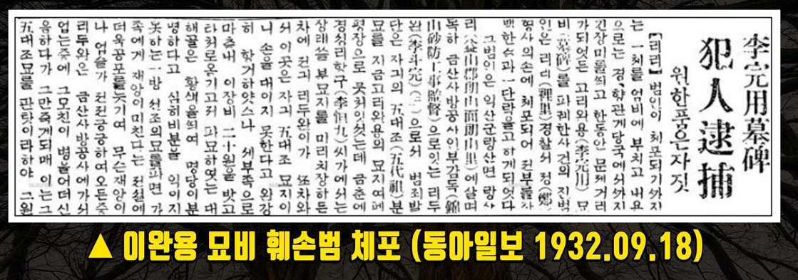 또한 이완용의 장남 이승구 부부의 묘도 2006년 8월 경기도 고양시에서 심하게 훼손된 채 발견되었는데요. 발견 당시 묘는 봉분이 사라져 아카시아 나무가 자라고 상석만 남아 있었으며 상석도 파손, 묘 주인을 알리는 글씨만 겨우 알아볼 정도였다고 합니다. 지역 원주민들의 증언에 의하면, 해방 직후 마을 주민들이 묘의 불을 지르고 무덤을 파헤쳤다고 합니다.