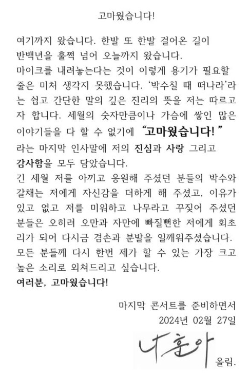 나훈아는 2월 27일 '고마웠습니다!'라는 제목의 편지를 공개했습니다. 나훈아는 편지를 통해 '마이크를 내려놓는다는 것이 이렇게 용기가 필요할 줄은 미처 생각지 못했다'며, '박수칠 때 떠나라는 쉽고 간단한 말의 깊은 진리의 뜻을 저는 따르고자 한다'고 밝혔습니다.