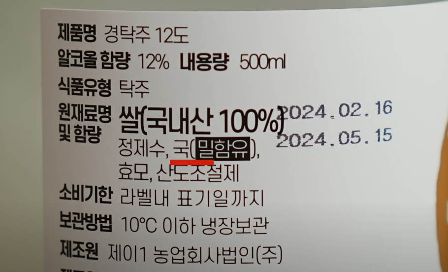 알콜 도수는 12도, 탁주 치고는 꽤 높죠 용량은 500ml 재료는 쌀, 정제수, 국, 효모, 산도조절제 이렇게 들어가 있습니다. '국'이 뭐냐 하면, 쌀의 전분을 당분으로 분해시키는 미생물들을 모아 놓은 것입니다. 이 당을 효모가 먹고 술을 만드는 겁니다. '산도조절제'는 경탁주의 경우에는 젖산, 구연산 등이 들어갔습니다. 술의 발효 초기에는 주변 잡균에 의해 술이 상할 수 있기 때문에, 이런 젖산이나 구연산을 넣어서 술의 ph를 낮춰 줍니다. 그럼 안정적으로 술을 만들 수 있습니다. 많은 양조장에서 흔하게 쓰는 방법입니다. 그리고 술에 약간의 산미도 부여해 줍니다. 다른 감미료나 첨가물은 안 들어 갔습니다. 가격은 2병에 28,000원이니까 1병에 14,000원입니다.