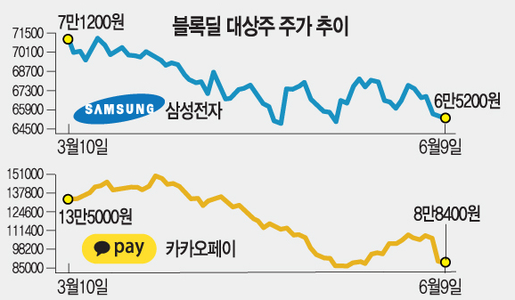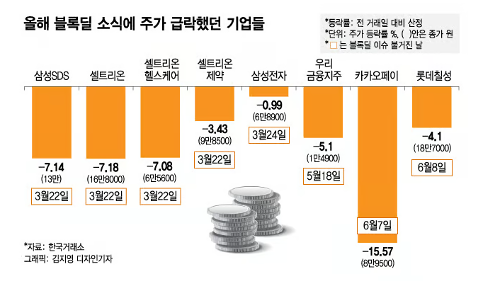 시총 규모가 더 큰 대형주도 블록딜이 일어나면 주가가 크게 출렁입니다. 삼성전자 주식은 지난 3월 홍라희 전 리움미술관장이 상속세 마련을 위해 1994만1860주(약 1조3700억원)를 블록딜로 처분한 뒤 하향 조정됐습니다.