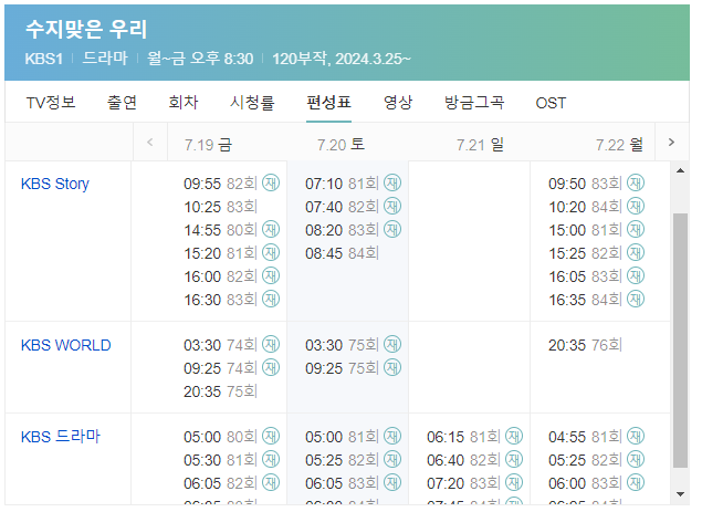 KBS 스토리는 7/20 토요일의 경우는 7시 10분부터 9시20분까지, 7/21 일요일의 경우는 재방송 일정이 없으며, 7/22 월요일 9시50분~10:20분에 재방송이 예정되어 있습니다. 편성일정이 불규칙적이기 때문에 편성표를 꼭 확인하시기를 추천드립니다.