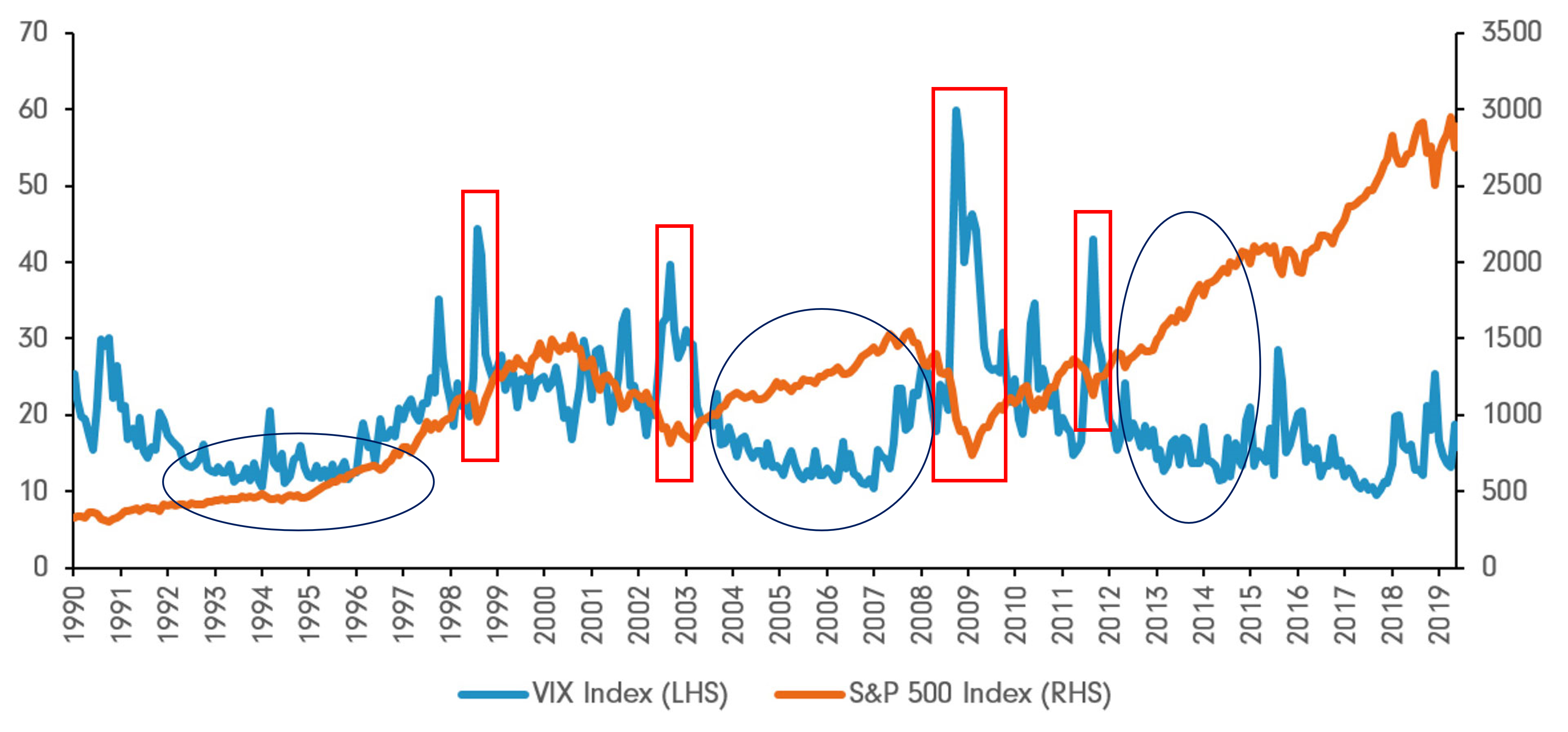 빅스지수는 일반적으로 S&P500과 반대로 움직인다.
