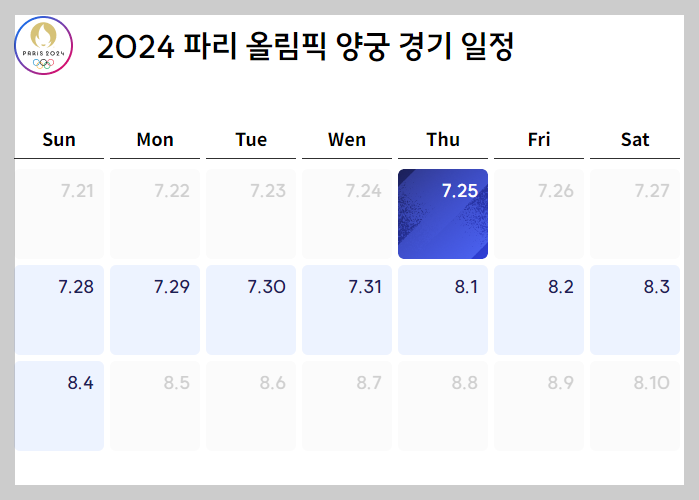 양궁 경기는 7월 25일부터 8월 4일까지 진행됩니다. 주요 일정은 다음과 같습니다.