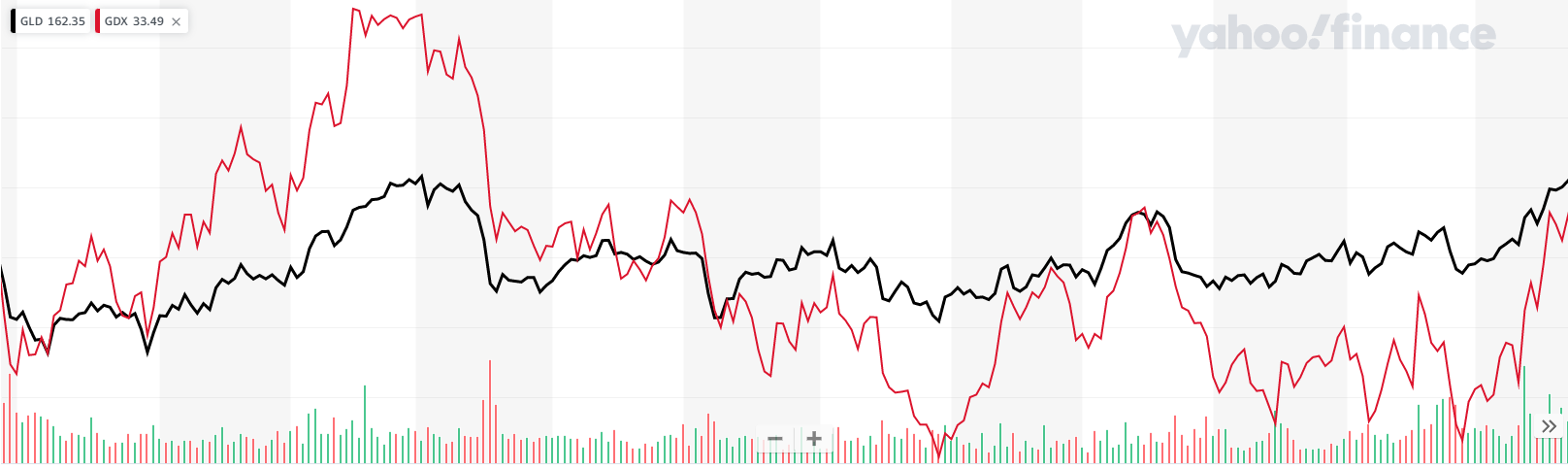 금 가격과 금광업체 ETF는 대부분 같은 방향으로 움직인다.