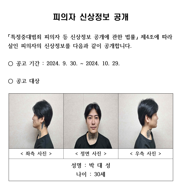 박대성의 신상정보는 전라남도경찰청 홈페이지 '공지사항'에서 확인(바로가기 클릭)하실 수 있으며, 아래에서 파일을 바로 다운받아 보실 수도 있습니다.