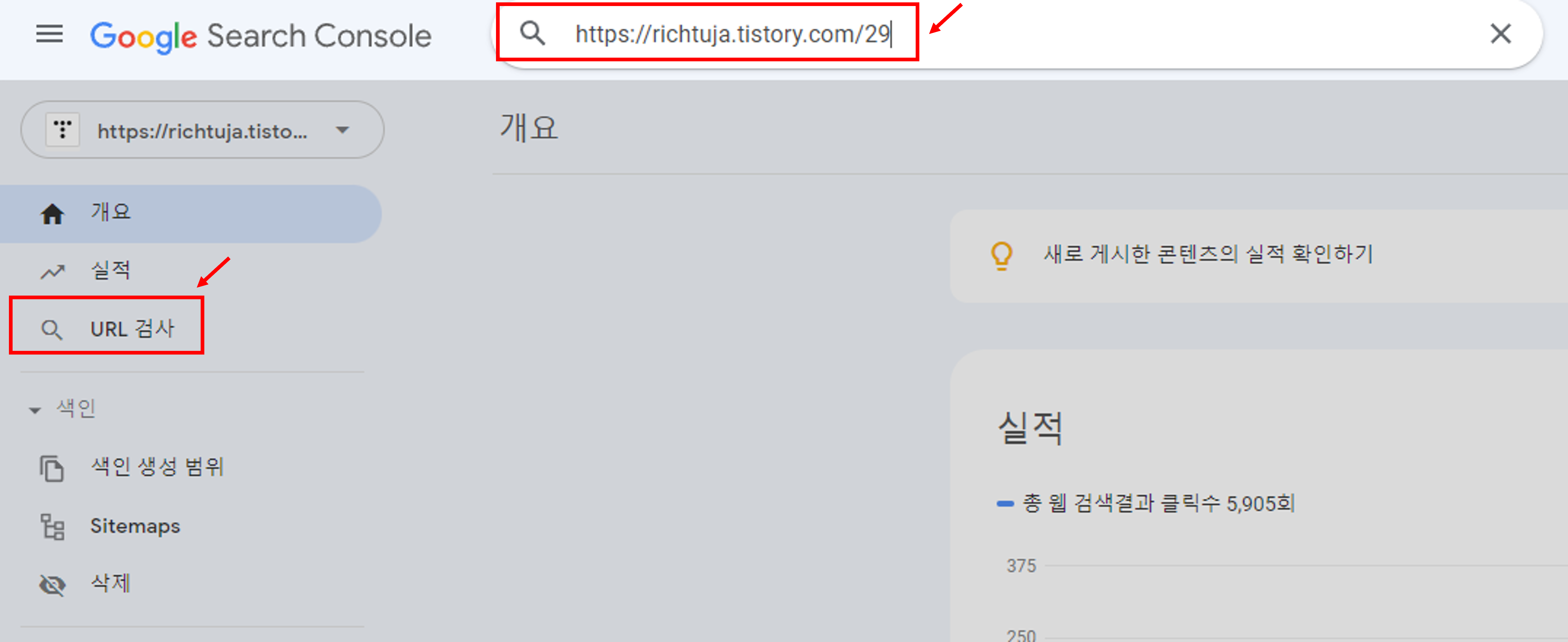 1) 구글 서치콘솔 사이트에 들어가 URL검사 클릭 후 URL 입력