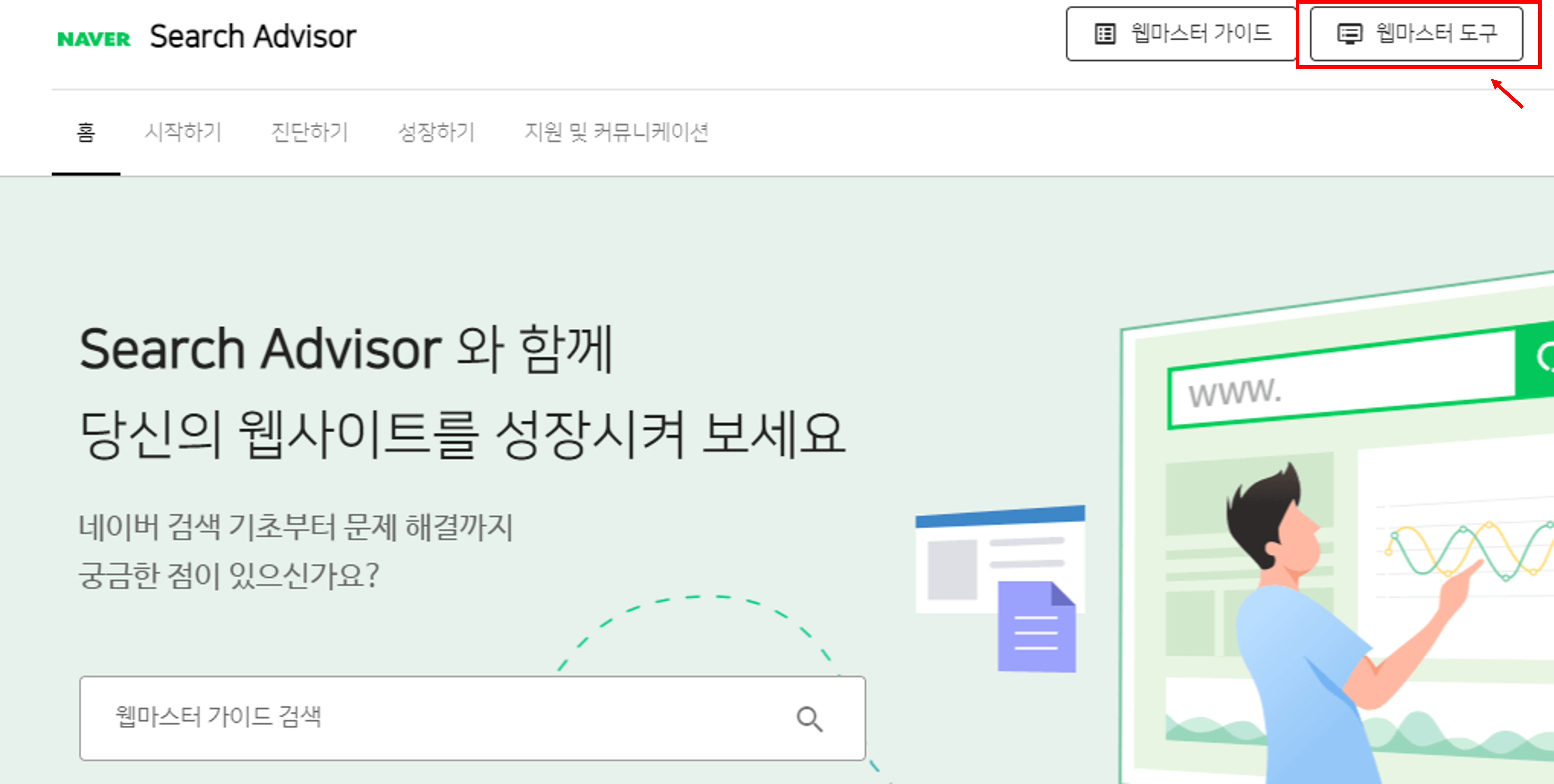 1) 사이트 방문 후 '웹마스터 도구' 클릭