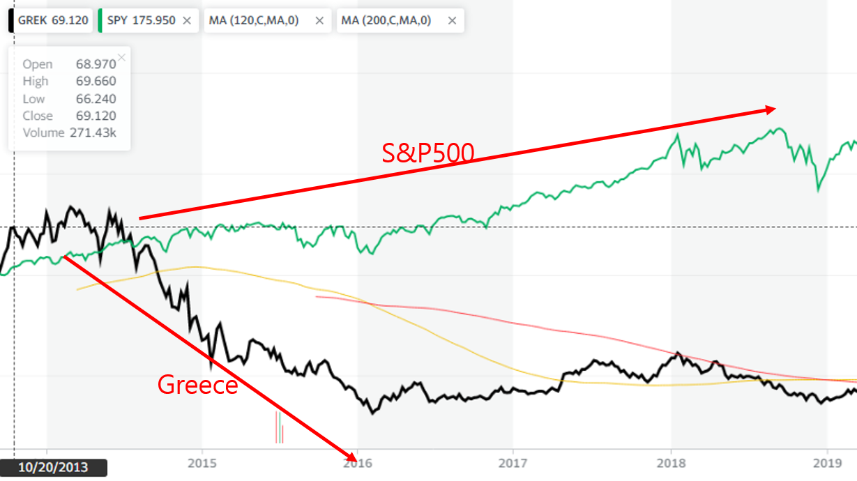 그리스 주가는 2014년부터 2016년까지 2년에 걸쳐 하락한다.