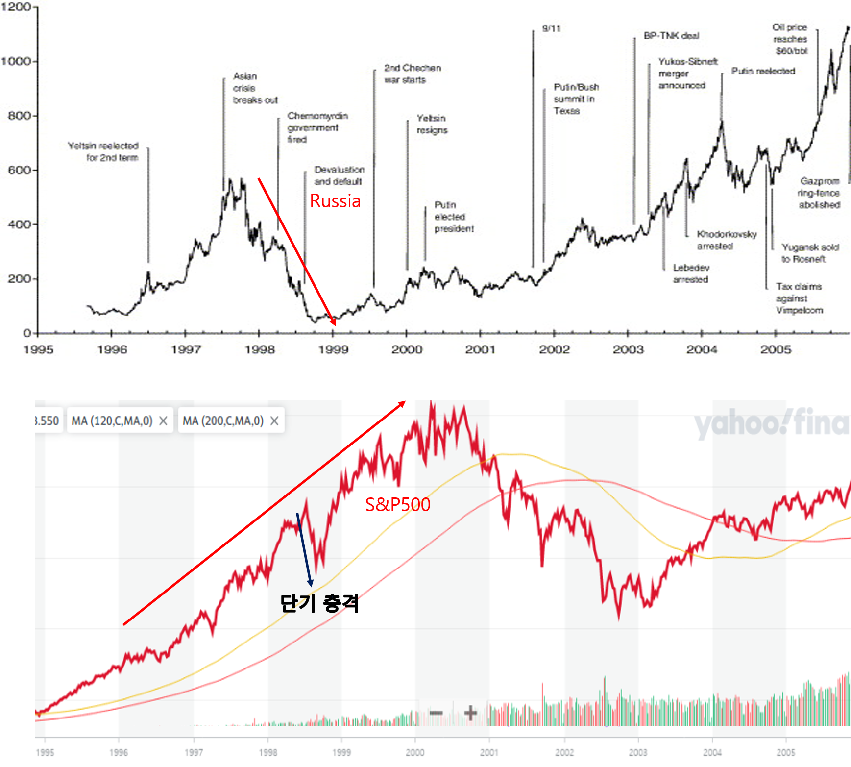 하지만 이번에도 S&P500은 러시아 금융위기에 큰 영향을 받지 않고 꾸준히 올랐다.