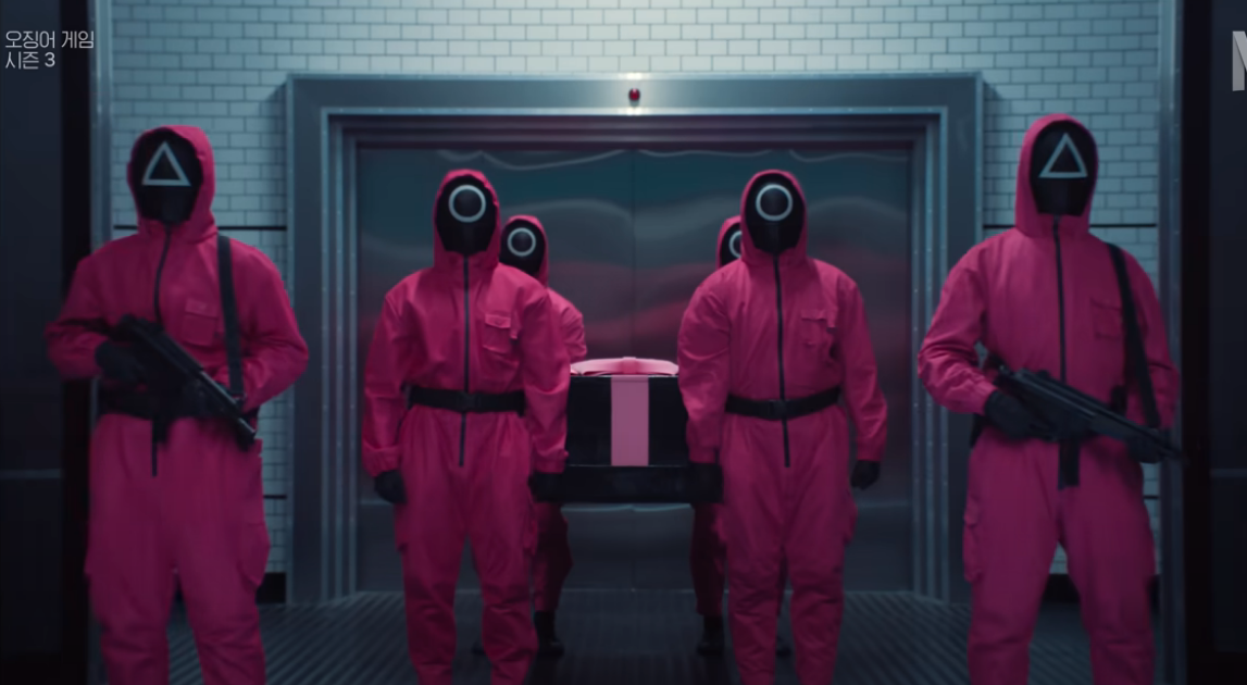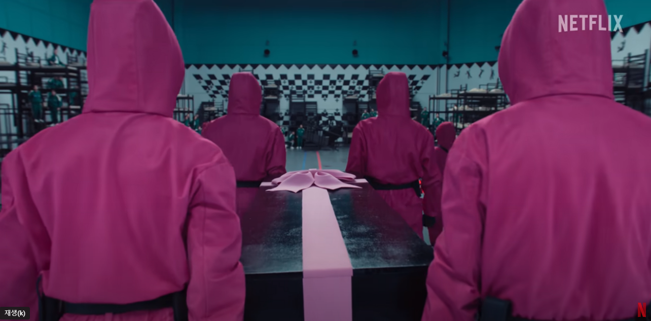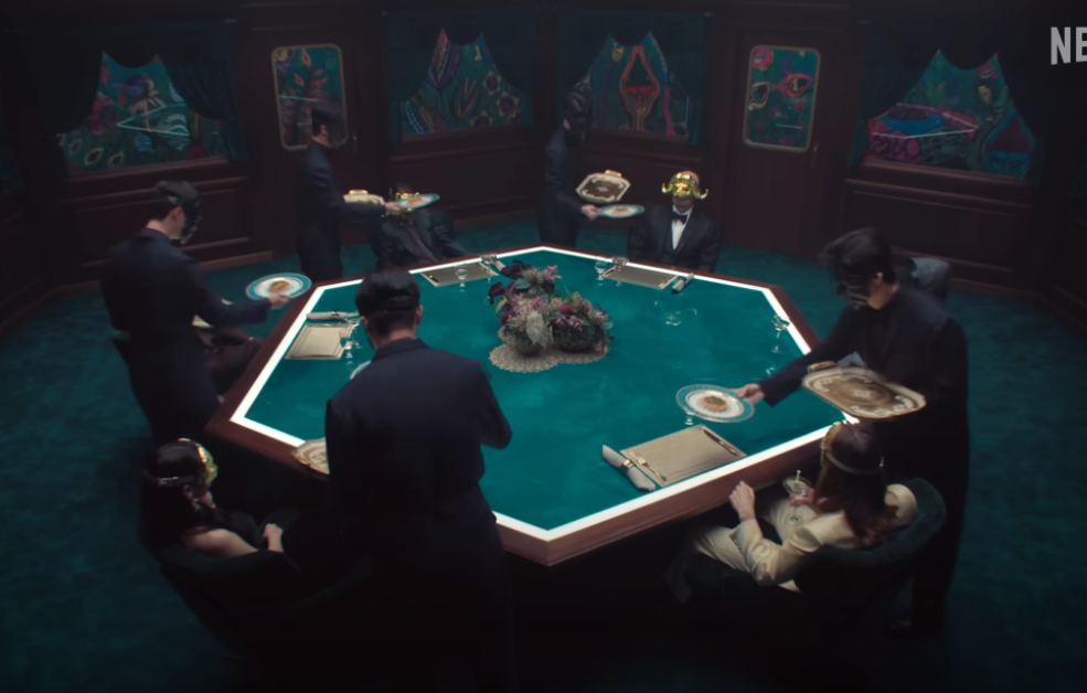 한편 잠깐 나오는 이 장면 속 황금 가면을 쓴 사람들 앞에는 고급 음식이 놓여 있습니다. 게임 참가자들에겐 생사를 건 죽음의, 게임이지만 귀빈들에겐 팝콘을 먹으며 영화를 보듯 유희거리에 지나지 않는다는 걸 간접적으로 보여주는 장면인데요. 이전 시즌에선 귀빈들이 멀찍이서 게임을 관람하는 모습이 비춰졌는데 이번 시즌에는 사람들이 죽을 때마다 즐거워하는 리액션을 보여주며 얼마나 인간성이 결여되어 있는지 더 끔찍하게 보여줄 것 같습니다.