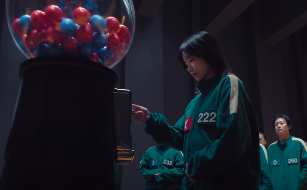 한국인들에겐 반가운 기계이죠. 옛날 문방구 앞에 있던 뽑기 게임기인데 레버를 돌려 무작위의 구슬을 획득할 수 있습니다. 현실에선 그 구슬을 반으로 쪼개 안에 있는 내용물을 확인할 수 있죠. 참가자들은 청 구슬을 뽑아 그 구슬에 따라 팀이 정해지는 것으로 보입니다. 구슬을 열어보면 안에 쪽지 같은 게 들어 있을 수도 있는데, 이 속에는 게임의 세부 내용이 결정되는 트릭이 숨겨져 있을 수도 있죠.