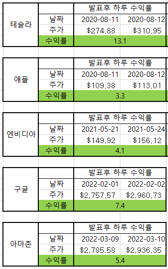 테슬라의 경우 액면분할 3개월 후 13.9%, 6개월 후 35.6%, 1년 후 47.6%의 수익률을 기록한다.