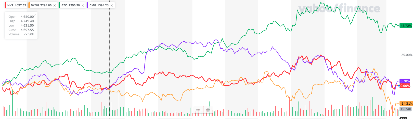 NVR(빨간색), 부킹홀딩스(주황색), 오토존(초록색), 치폴레(보라색) 네 종목의 1년 주가 그래프이다.