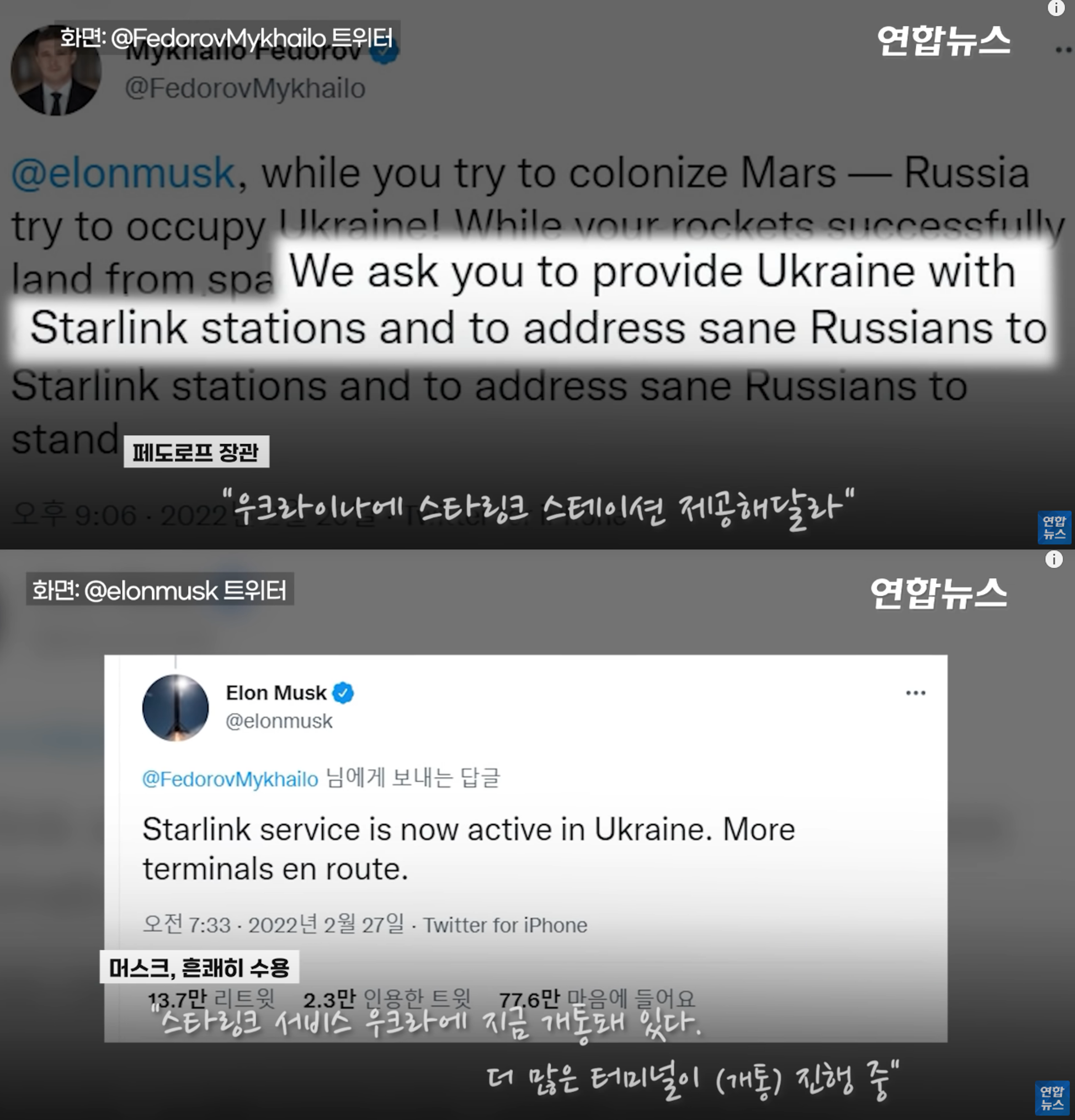 "우크라이나에 스타링크를 제공해달라"며 도움을 요청했고,