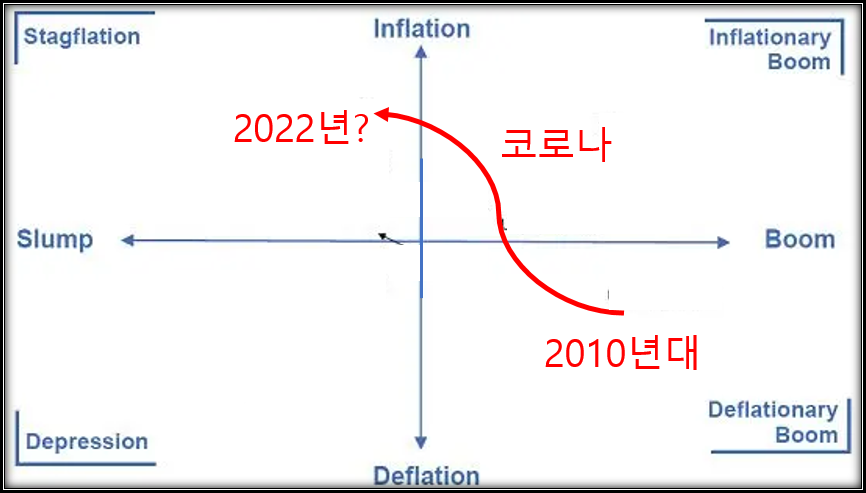- 인플레 붐(=리플레이션) : 경기는 좋고, 이 때문에 물가도 오른 경우로, 코로나로 경기 부양을 한 2020년 3월~2021년이 대표적