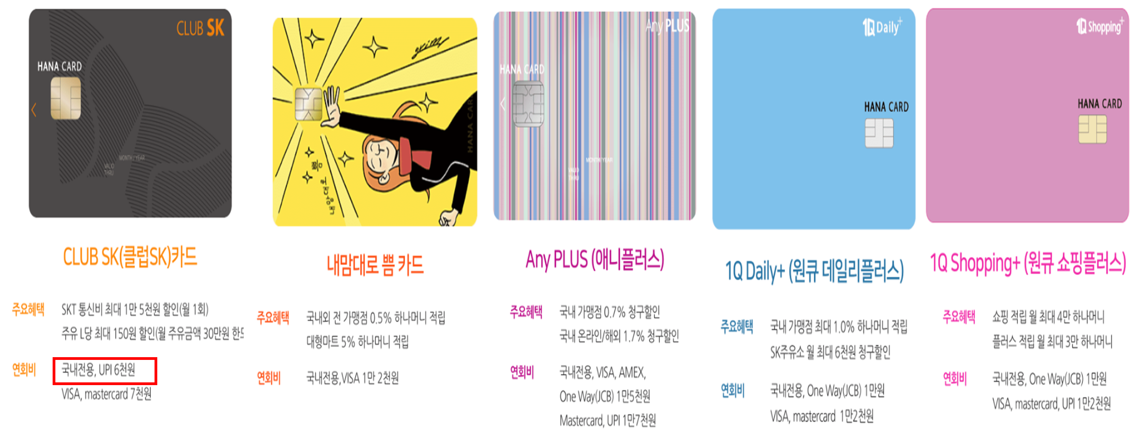 위 혜택을 받을 수 있는 카드는 다음과 같은 다섯가지입니다. 그 중에 연회비가 가장 작은 것은 CLUB SK카드로, 6천원입니다.