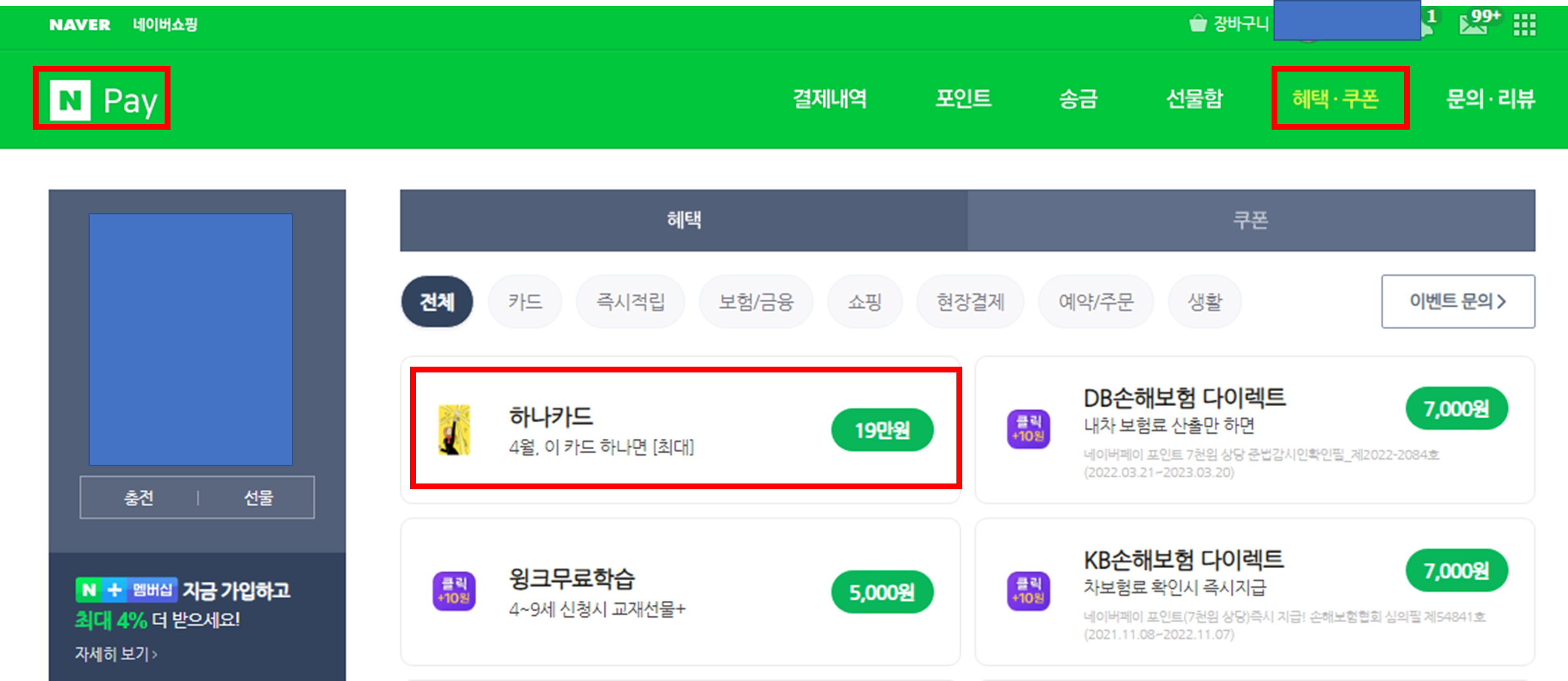 네이버→네이버페이→혜택·쿠폰→하나카드 클릭하시면 됩니다.